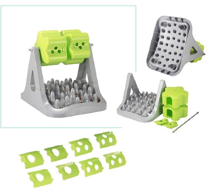 How This Dog Treat Dispenser Game Works: First the food is placed in the top feeder. The dog must turn the slow feeder to get the food through the leak holes, then continue to search for food on bottom plate maze.