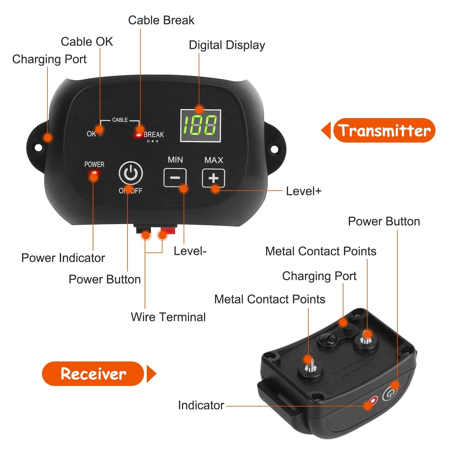 *Efficient Dog Fencing System*:The transmitter,receiver and boundary wire forms an effective fencing system together to deter our dogs from the designated area,which greatly ensures our pets’ safety. The boundary wire creates an effective signal field when the transmitter is working. If your dog tends to walk out of the boundary,the transmitter will emit a harmless radio signal. Once the signal is detected by the receiver,it will automatically start beep or shock mode to urge your dog to go back into the boundary.