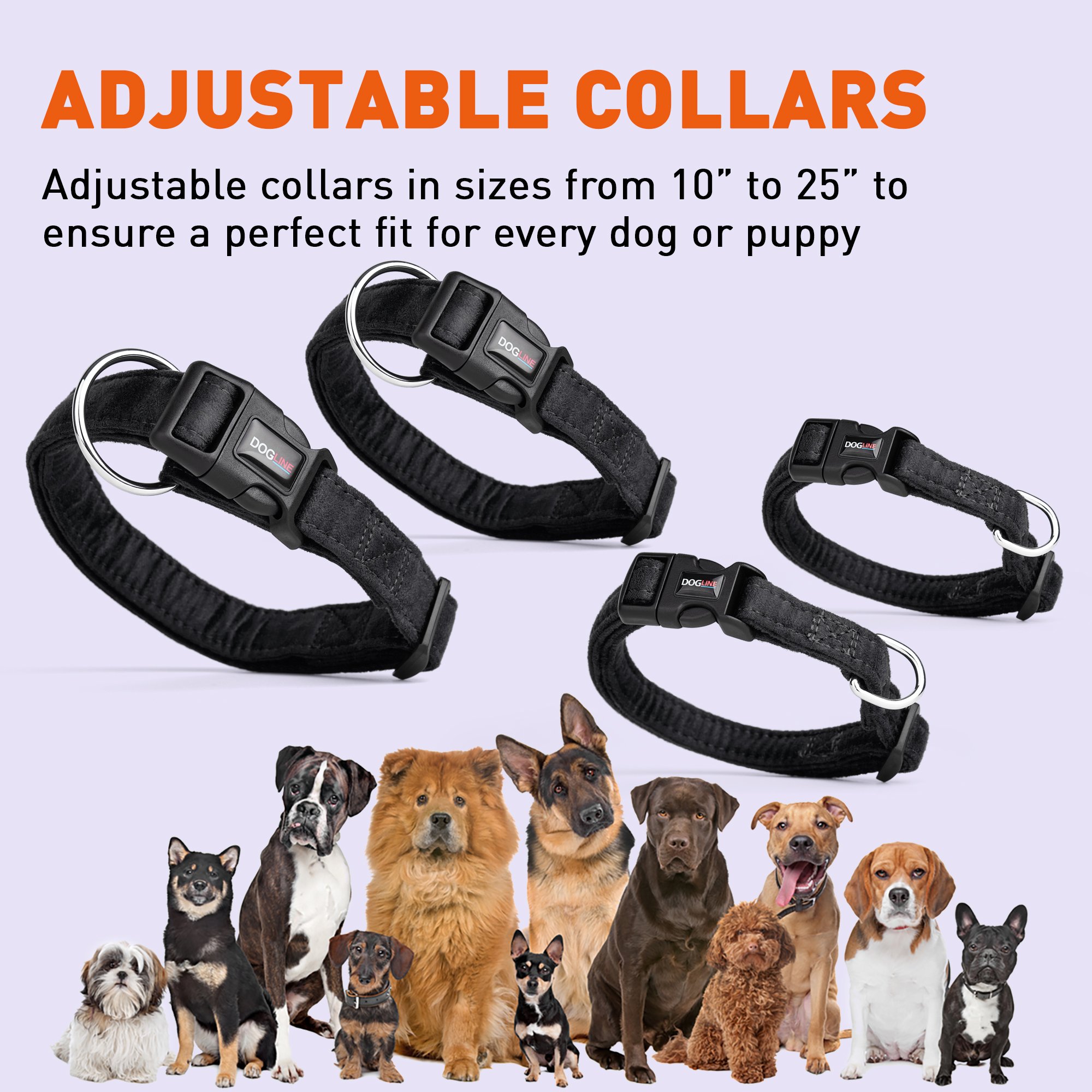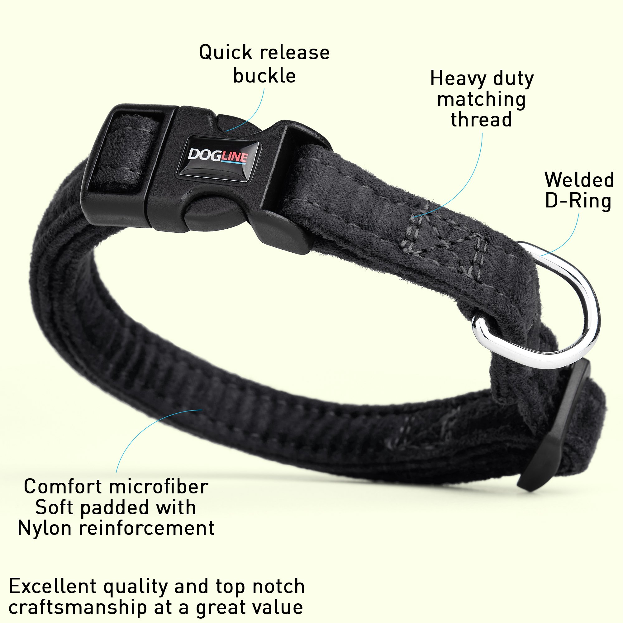 Introducing Dogline's New Comfort Flat Microfiber Collar Collection. Made of super soft and durable microfiber material, the Comfort Flat Collar is the next generation of collars that provide exceptional comfort and support for the dog and its owner.  The best feature of our Comfort Flat Collars is that it provides special control and most importantly safety in any situation. These collars are available in 9 beautiful and rich colors from classy red to gorgeous purple.  Collars are available in 4 sizes and are suitable for any breed and size of dog. All collars are handmade and stitched with wax thread. These collars will not stretch and will not break as our European technology features nylon cord wrapped in microfiber.  Two-ply design made with super soft fabric Quick release, no stress buckle design Reinforced with nylon webbing Machine washable.