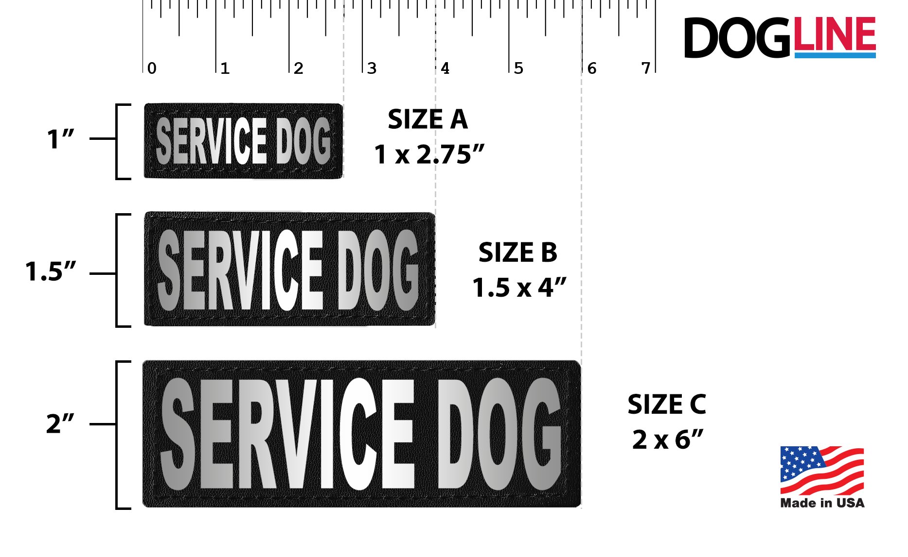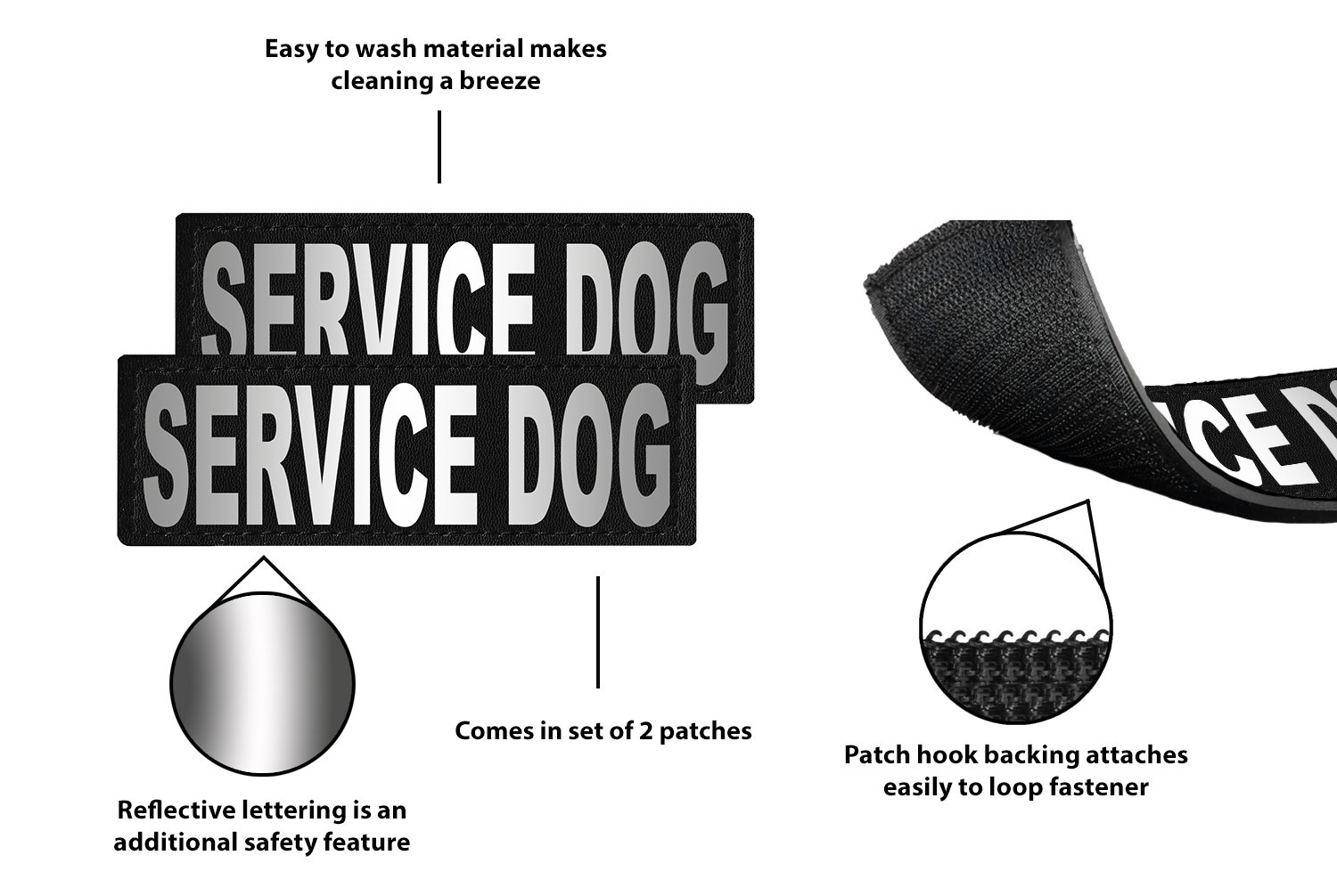 These Removable Reflective Harness/Vest/Collar Patches have reflective printed letters and are attached with hook and loop fasteners. Unlike embroidery patches, they will not get caught on objects and the thread will not come apart. Large letters make it easy to read messages. Letters are reflective as a value-added safety feature. Easy to wash material makes keeping these patches clean a breeze. Patches come as a set of 2. Fits perfectly on our Unimax, Quest Harnesses, and MaxAire Vests. Available in sizes A, B, & C Size A - 1" x 2.75" Size B - 1.5" x 4" Size C - 2" x 6"
