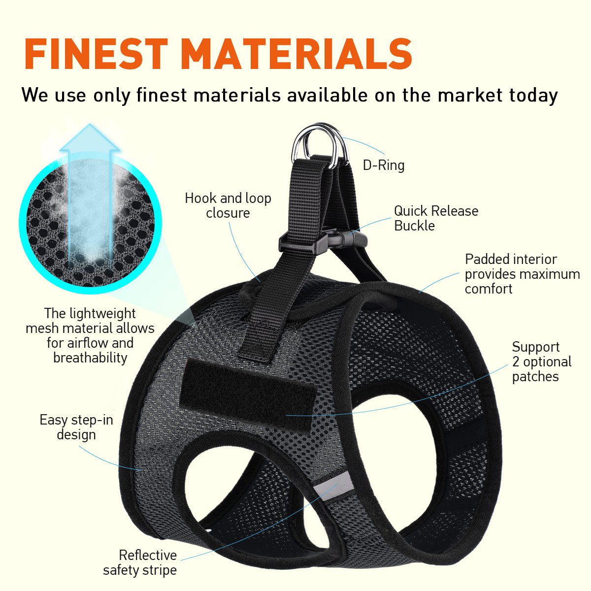 Optional removable reflective patches (sold separately) Our York Mesh Harnesses are soft, padded step in harnesses that provide exceptional comfort and durability. The padded interior provides maximum comfort and super softness! With the super smooth surface and quick release buckle, your pet will definitely feel special! This harness collection is available in 8 vibrant colors (including royal blue, teal, hot pink, purple, lime green, red, orange, and black) and is available in 7 sizes from XS to XXXL. They also come with reflective stripes for night walks! Prior to ordering, please be sure to measure the broadest part of the dog's chest (girth). The harness adjusts around the chest for an easy fit! Please review size charts included with the product pictures. Easy Step-In Design Perfect for hard to fit dogs! The lightweight mesh material allows for airflow and breathability. Hook-and-loop fasteners hold the optional patches firmly in place. Machine washable, but hand washing and air drying are recommended