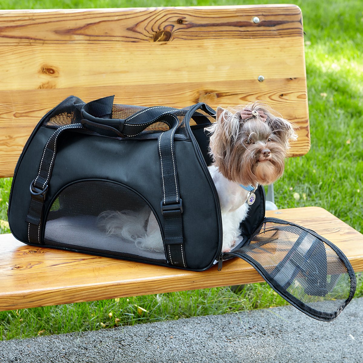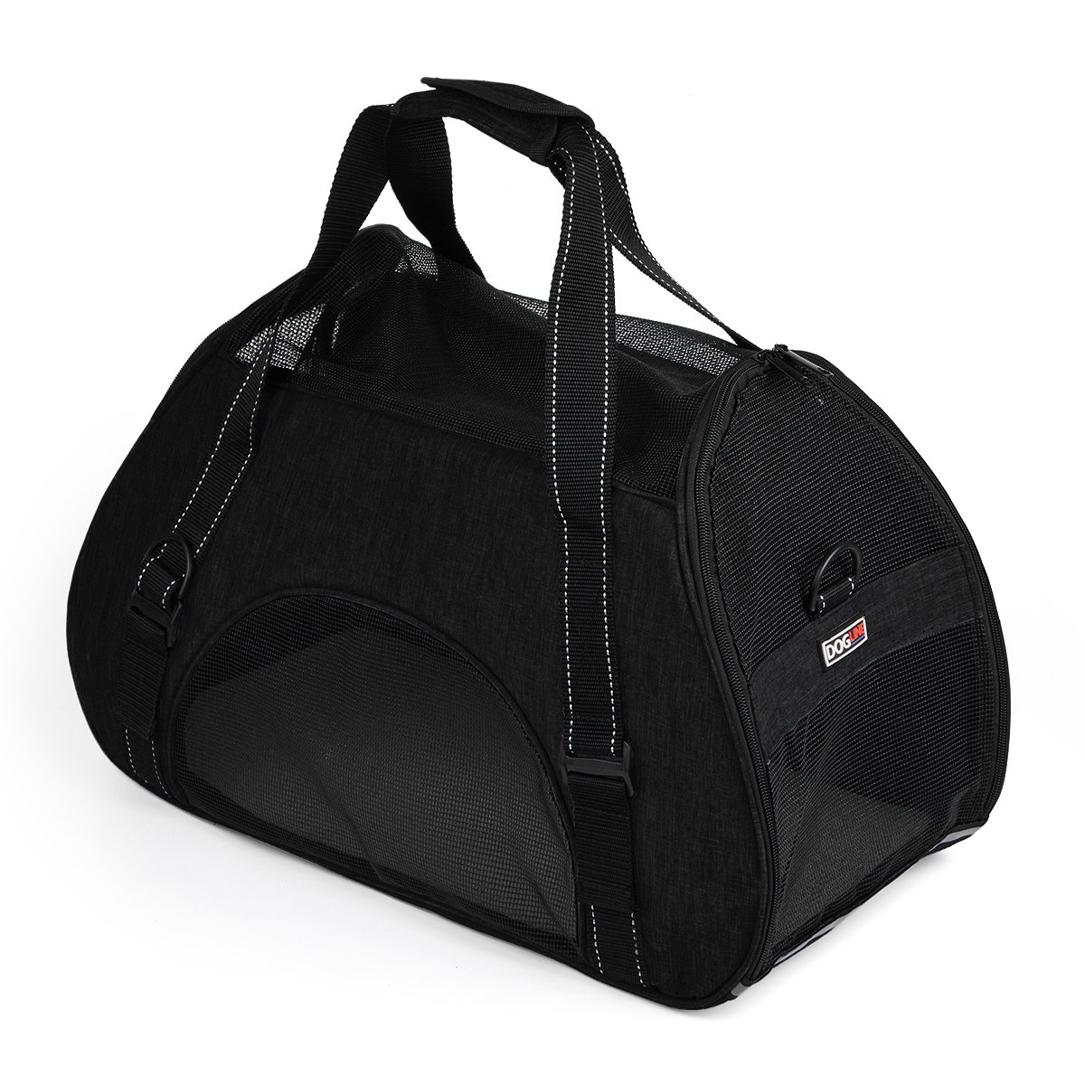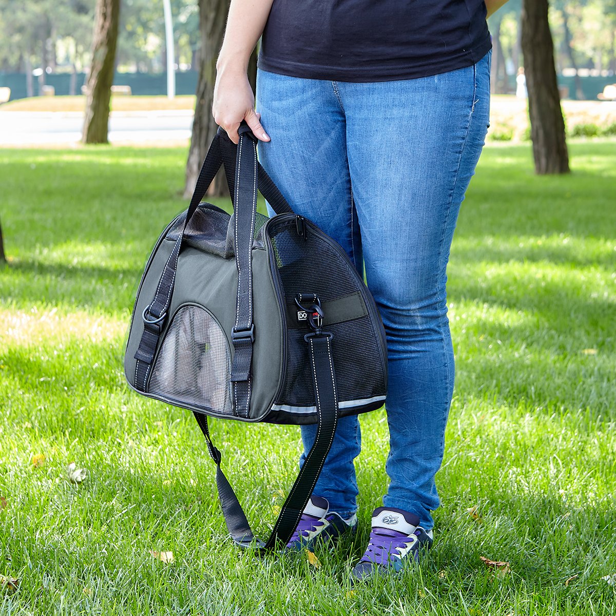 COMFORT, EASE, SECURITY: Our soft-sided Pet Carrier Bag offers an easy, secure and comfortable way to travel with your pet. Its features also include a removable floor for easy cleaning, a light and breathable mesh design, with an optional reinforced shoulder strap and handle to ensure the comfort of both you and your pet. AVAILABLE SIZES: L 17" x W 8" x H 12" L 22" x W 10" x H 14"