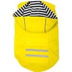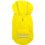 MEASURE YOUR DOG - NO REFUNDS OR EXCHANGES. Our Slicker raincoats will have your pup happily splashing through puddles. Made of durable PU material, these raincoats are fun as well as functional. They feature a fashionable striped lining to keep your dog cozy and dry. Other features include a handy pocket on the back for keys or other small items and reflective striping on the pocket and hood to make sure your pup is noticeable, even in low light. These raincoats have a leash hole at the neck and an extra-wide closure along the belly to give your pup some room to grow. Available in: yellow, cobalt blue, and raspberry pink.