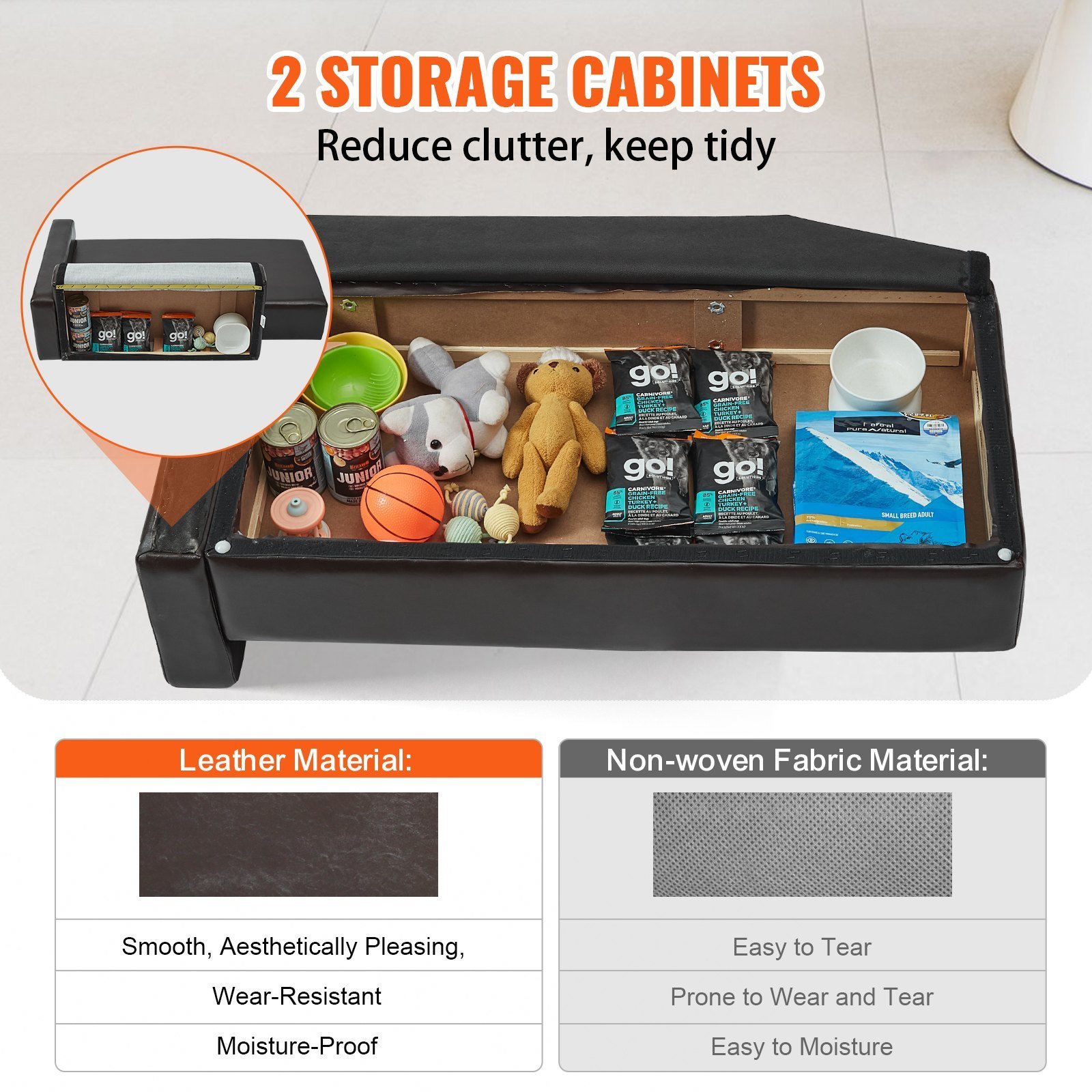 4.Practicality Meets Style: More than just a pet accessory, our dog sofa couch complements your home decor effortlessly. The smart design of the 2 storage cabinets frees up space, and its appearance blends seamlessly with any interior style.